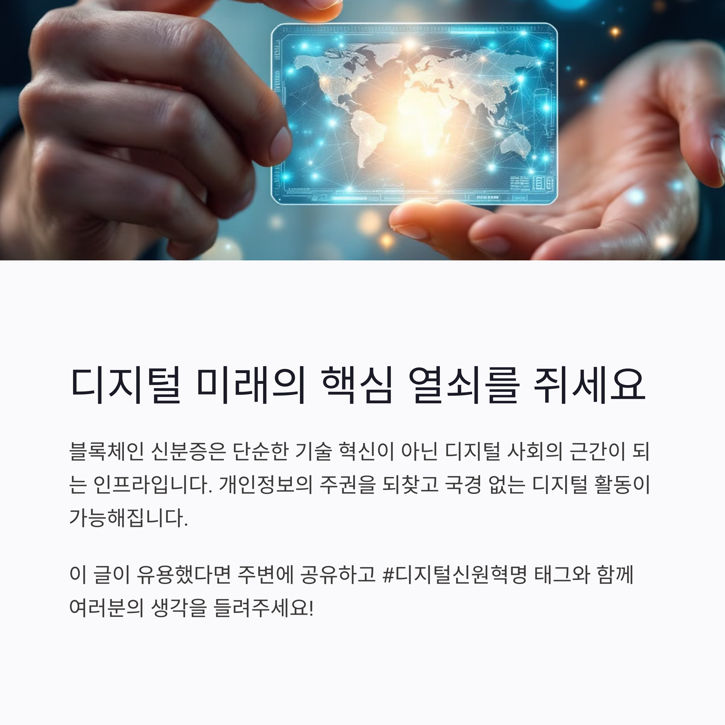 블록체인 신분증에 대한 여러분의 생각은 어떠신가요? 사용해보고 싶으신가요? 혹은 아직은 불안하다고 느끼시나요? 댓글로 자유롭게 의견을 공유해 주세요!