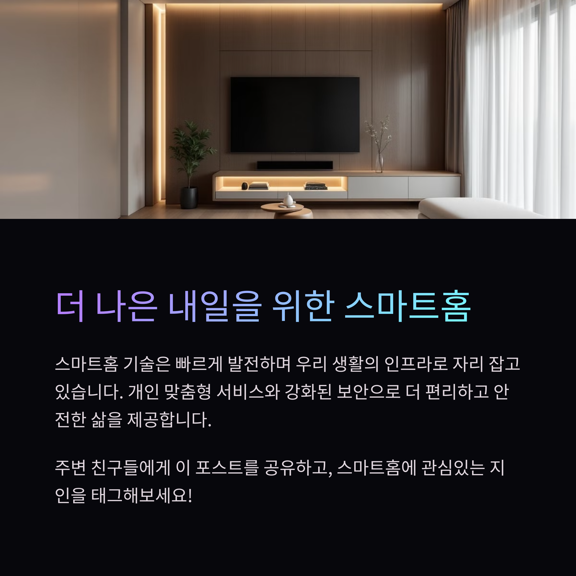스마트홈 시장은 기술, 수요, 환경 의식의 성장 속에서 지속적인 확장세를 보이고 있습니다. 단순한 유행이 아닌, 더 나은 삶을 위한 하나의 생활 인프라로 자리 잡아가고 있는 것이죠. 앞으로의 스마트홈은 더 정교하고, 더 연결되며, 사용자 맞춤형으로 진화할 것입니다. 기술이 곧 라이프스타일이 되는 시대, 스마트홈은 선택이 아닌 필수가 될지 모릅니다.