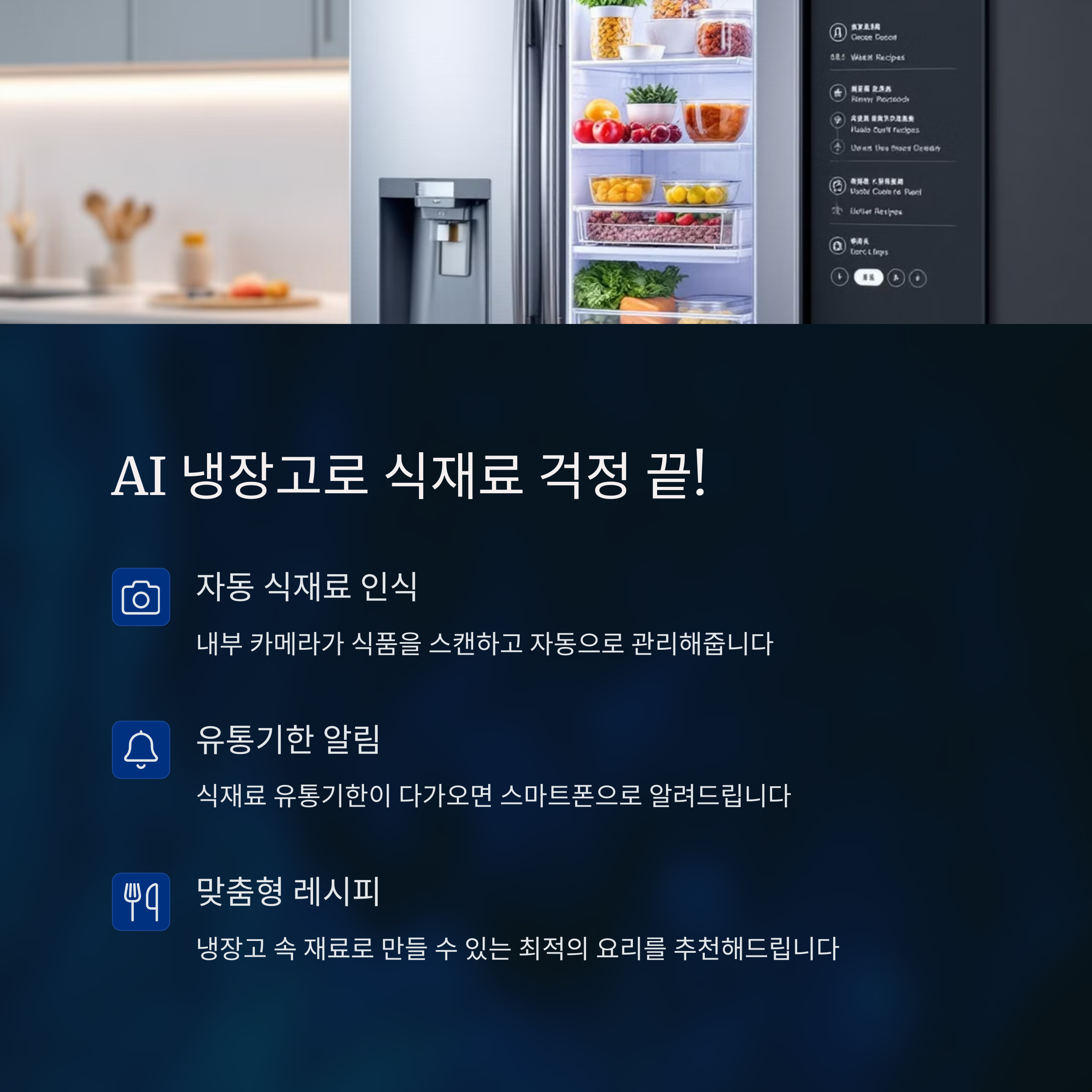 | AI 냉장고 | 스마트 조명 | 자동 도어락 |