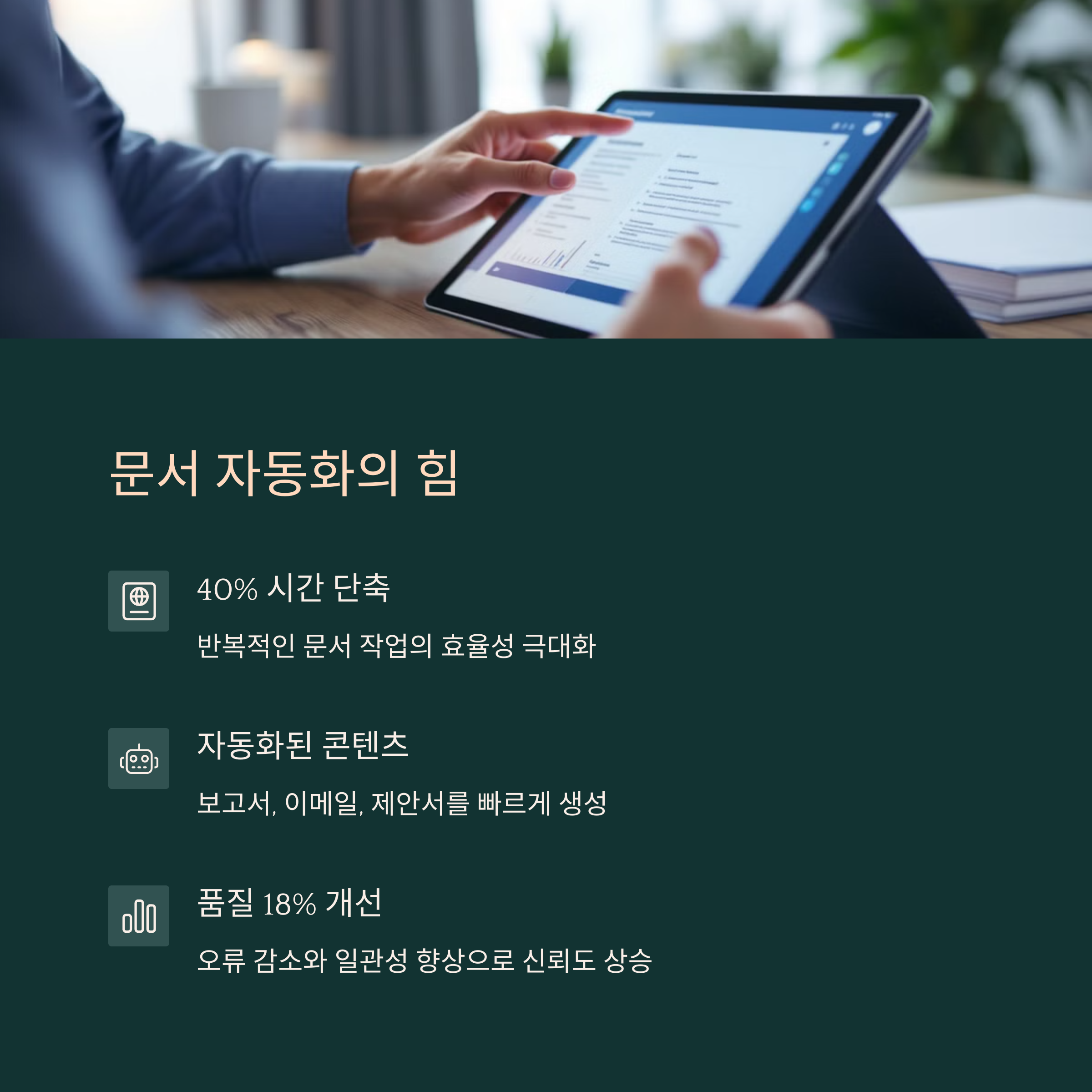 | 문서 자동화 | 보고서, 기획안, 회의록 자동 정리로 시간 절약 |