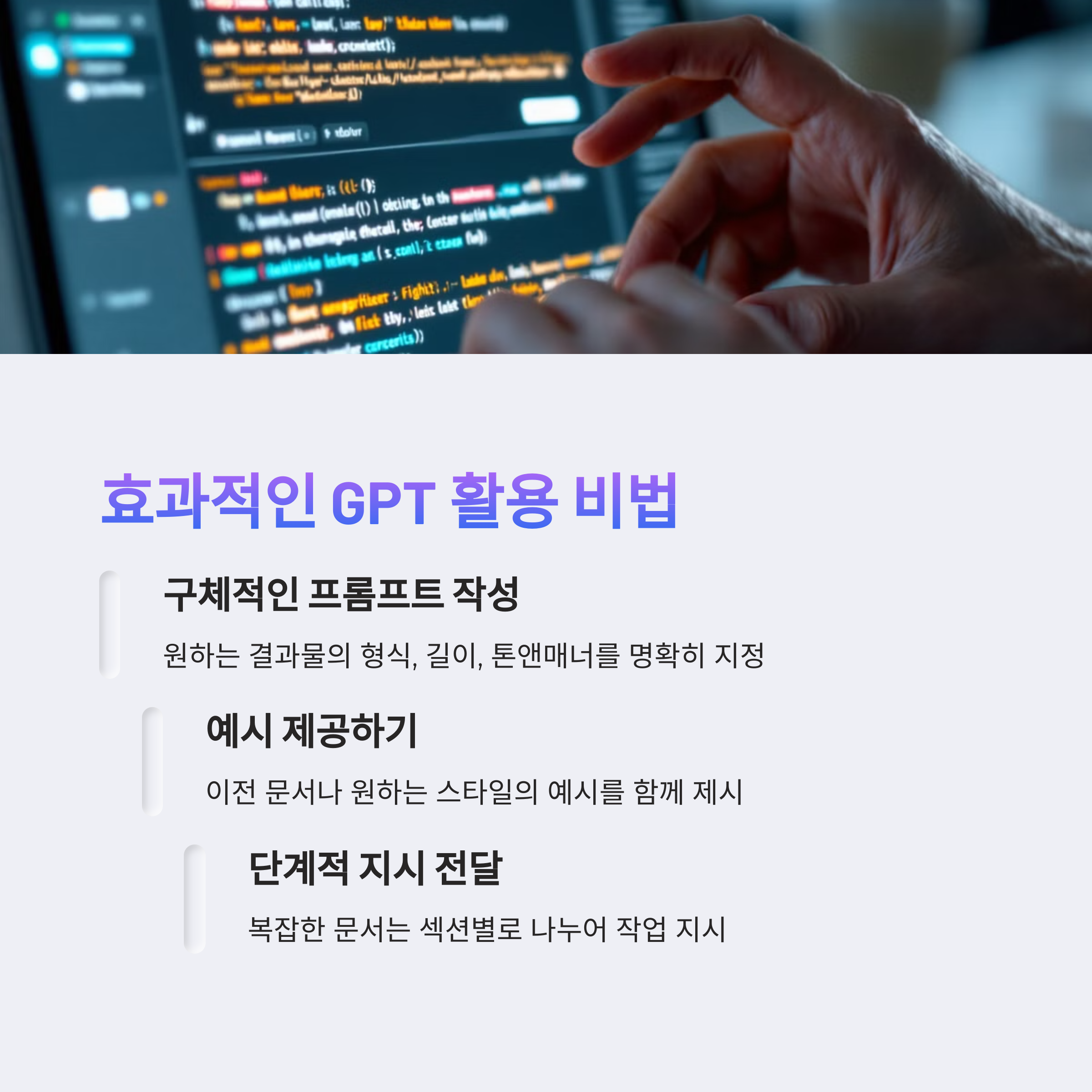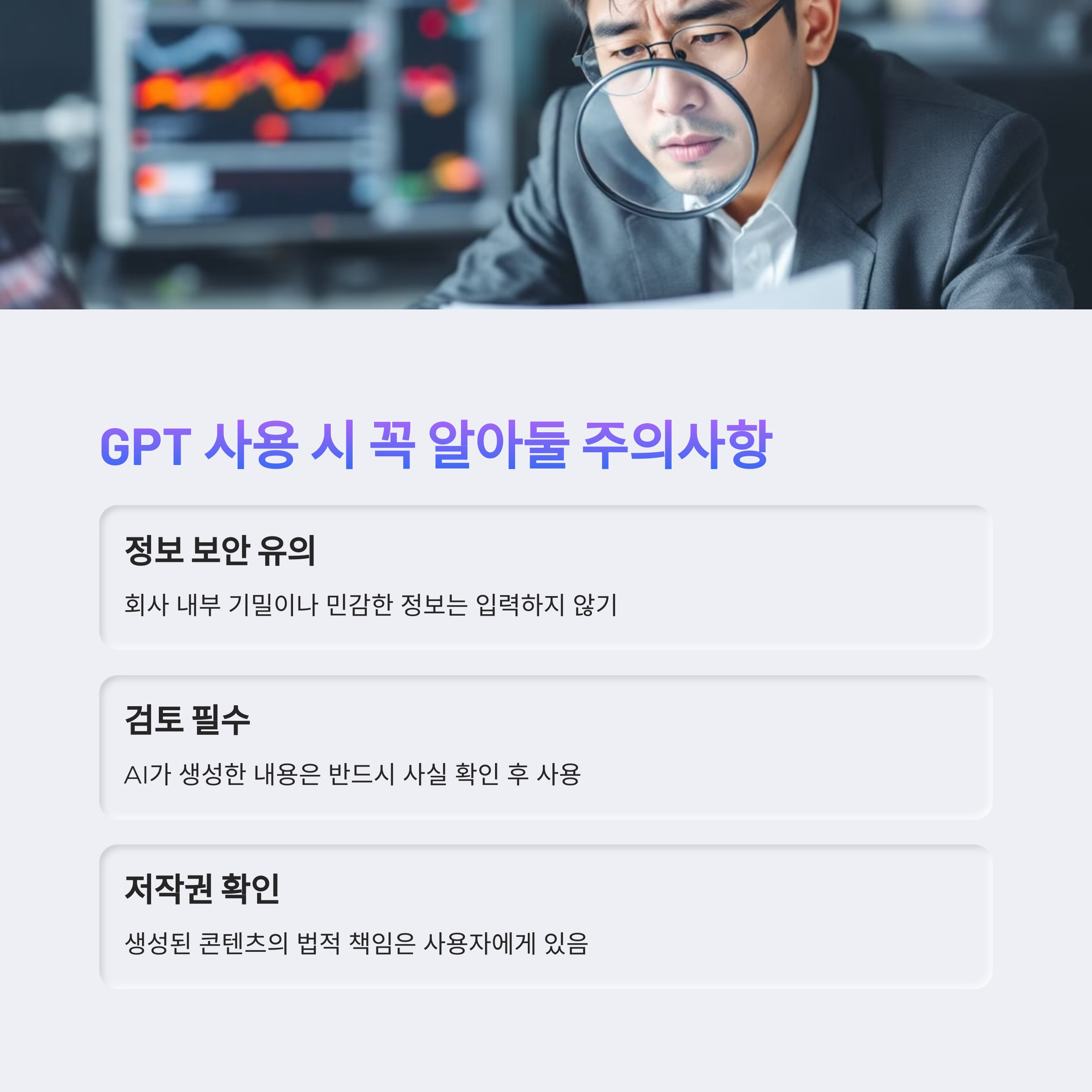 실무에 GPT를 활용할 때는 정확한 지시어(prompt)가 핵심입니다. 원하는 형식, 내용, 톤을 명확하게 전달하면 훨씬 유용한 결과물을 얻을 수 있어요. 또 내부 기밀이나 민감한 정보는 입력하지 않는 것이 보안상 안전합니다. 적절한 선을 지키면서 사용한다면 GPT는 최고의 사무 파트너가 될 수 있습니다.