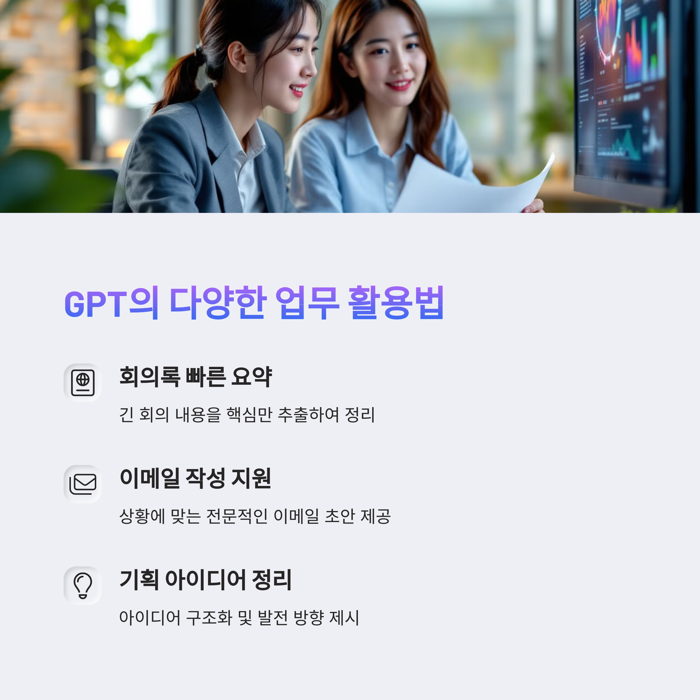 이제 GPT는 단순한 정보 검색 도구를 넘어 업무 보조 파트너로 자리잡고 있습니다. 반복되는 문서 작성, 기획안 아이디어, 이메일 초안 등 많은 시간을 절약해줄 수 있죠. 정확한 목적과 범위를 설정하고 사용한다면 실무에서의 활용도는 무궁무진합니다. 시간을 줄이고, 효율은 높이고, 똑똑한 직장인이라면 GPT 활용은 선택이 아닌 필수예요!