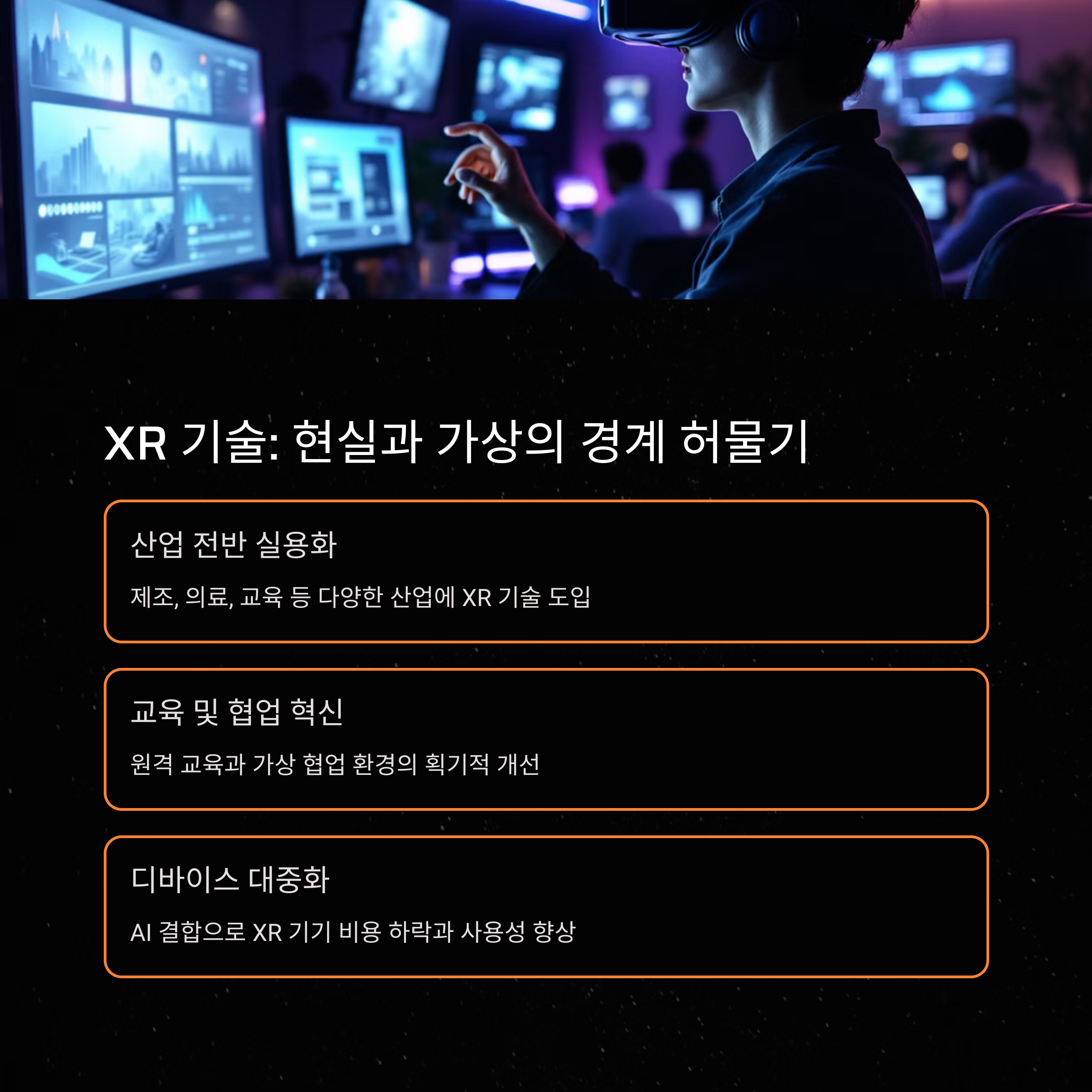올해 주목해야 할 또 하나의 키워드는 혼합현실(XR)입니다. 메타버스와는 달리 현실과 가상공간을 유기적으로 연결하는 방향으로 기술이 진화하고 있으며, 교육·의료·산업훈련 등 실용적인 분야에 빠르게 적용되고 있어요. 웨어러블 기기와 모션 인터페이스가 보편화되며, 사용자 경험의 새로운 표준을 제시하고 있습니다. 미래 산업에서 경쟁력을 갖추기 위해서는 XR 기술 도입을 고려해볼 타이밍입니다.