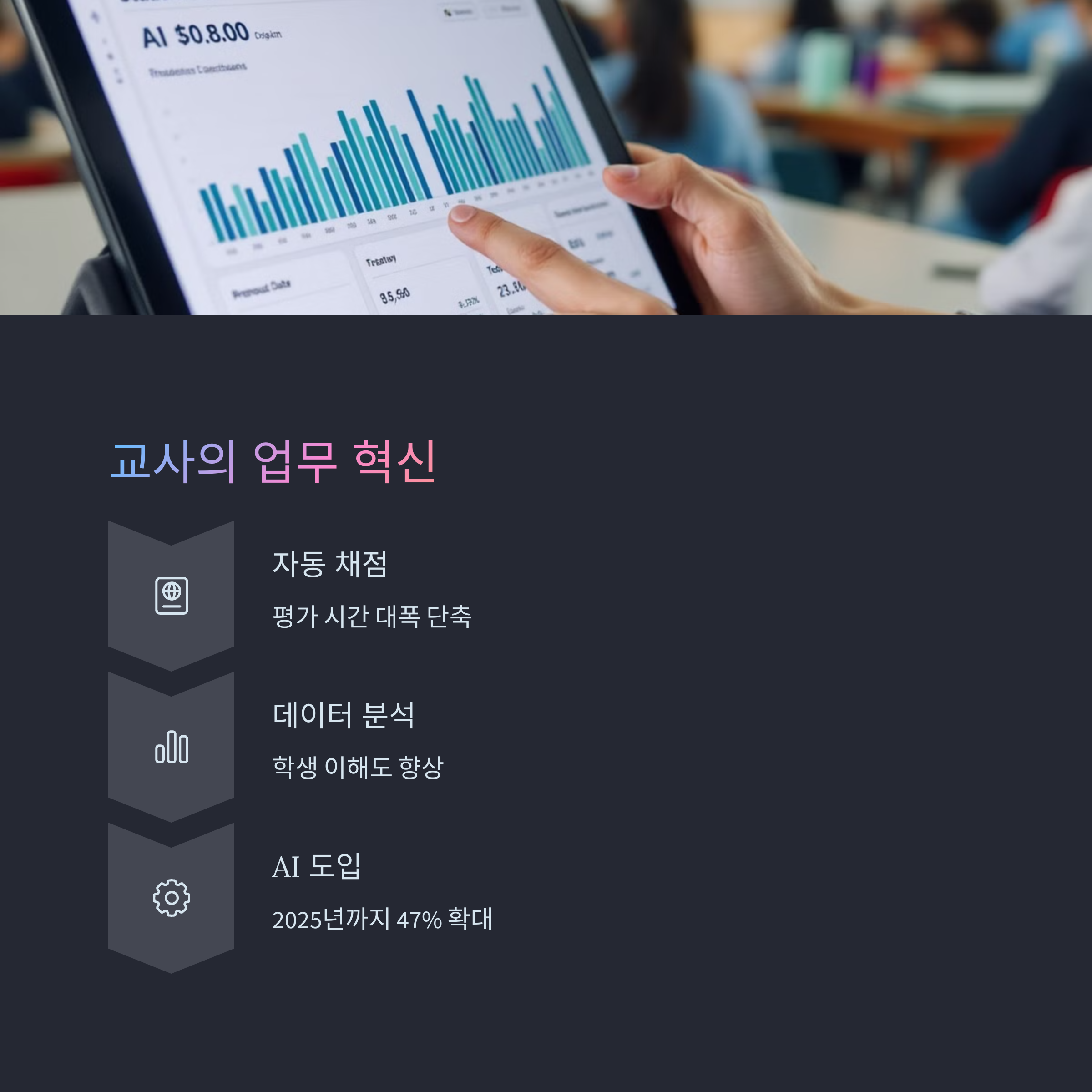 한 중학교에서는 AI 기반 학습 분석 프로그램을 통해 학생들의 성취도와 학습 패턴을 분석하고 주간 리포트를 제공하고 있습니다. 이를 바탕으로 교사는 학생의 강점과 약점을 보다 빠르게 파악할 수 있으며, 상담 시간에도 더 구체적인 피드백이 가능해졌습니다. 또, AI가 자동으로 수행한 문제의 난이도 조절을 해주어 학생들의 몰입도와 흥미도 함께 높아지고 있습니다.