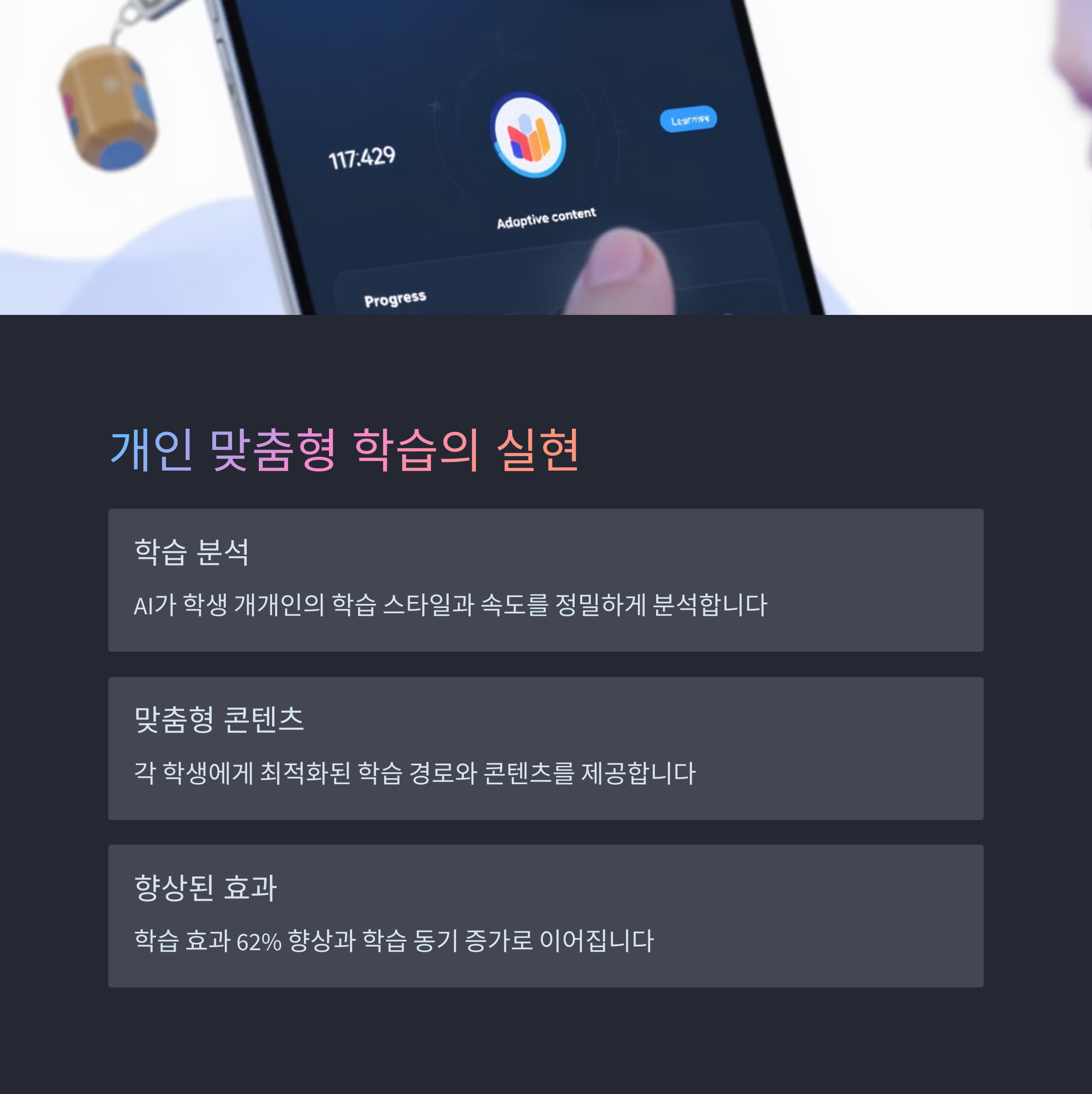 | 개별 수준에 맞춘 영어·수학 학습 보조 | 학습 패턴 분석 통한 맞춤 피드백 제공 | 문맥 이해 기반 서술형 채점 가능 |