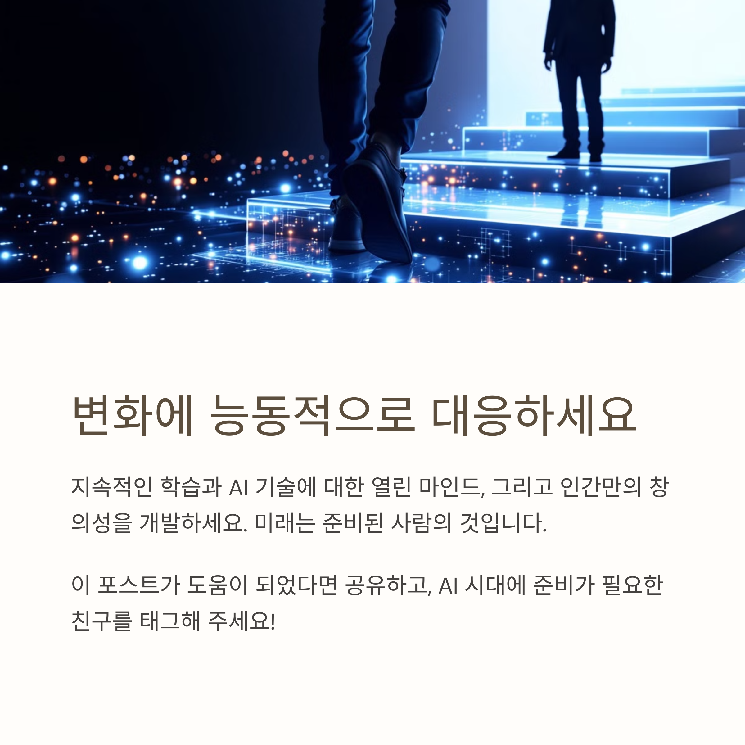AI 시대는 단순히 기술의 발전이 아니라 직업의 의미와 일의 방식 자체를 변화시키고 있습니다. 두려움보다 중요한 것은 변화의 흐름을 읽고, 능동적으로 나의 위치를 재정비하는 자세입니다. 반복적인 작업은 AI에게 맡기고, 사람만이 할 수 있는 감성과 창의력을 발휘하는 것이 진정한 경쟁력이 될 것입니다. 지금부터라도 작게라도 시작해 보세요. 변화는 준비된 사람에게 기회가 됩니다.